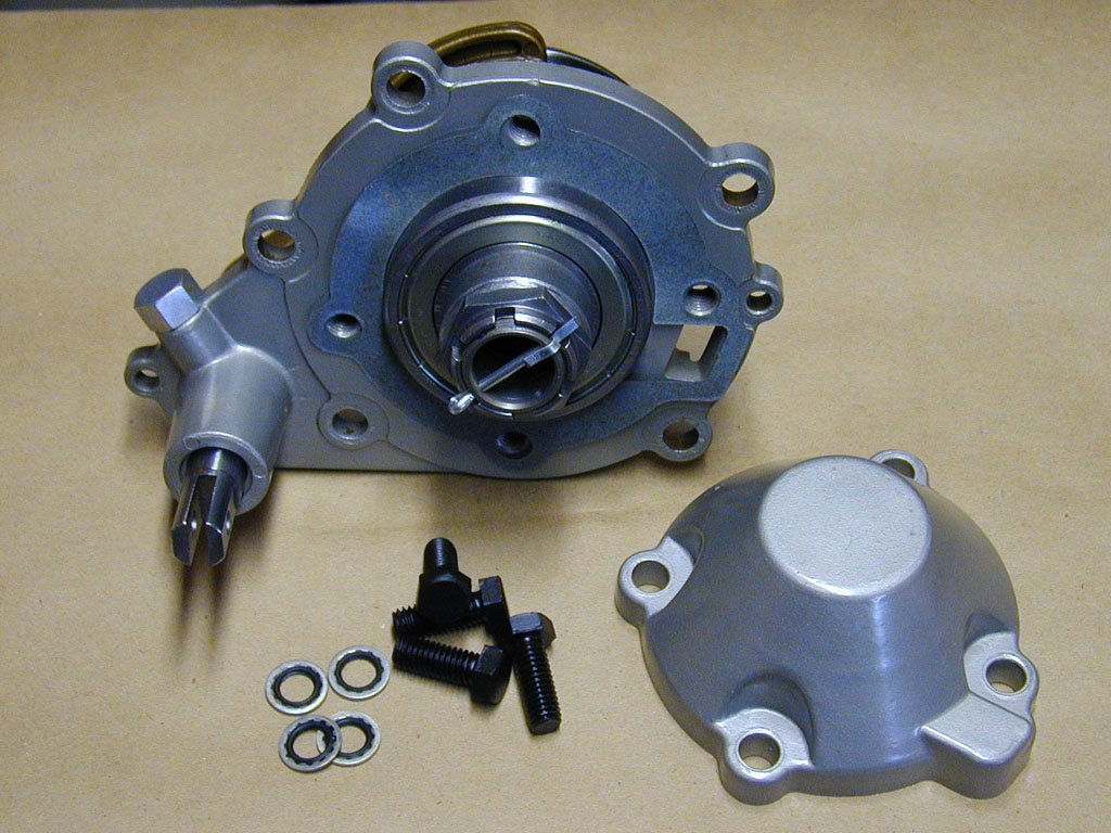 Finalize the rear cover/shift mechanism w/the bearing cap & gasket. It's this bearing cap and bearing that finally clamps the stationary gear tight in place.